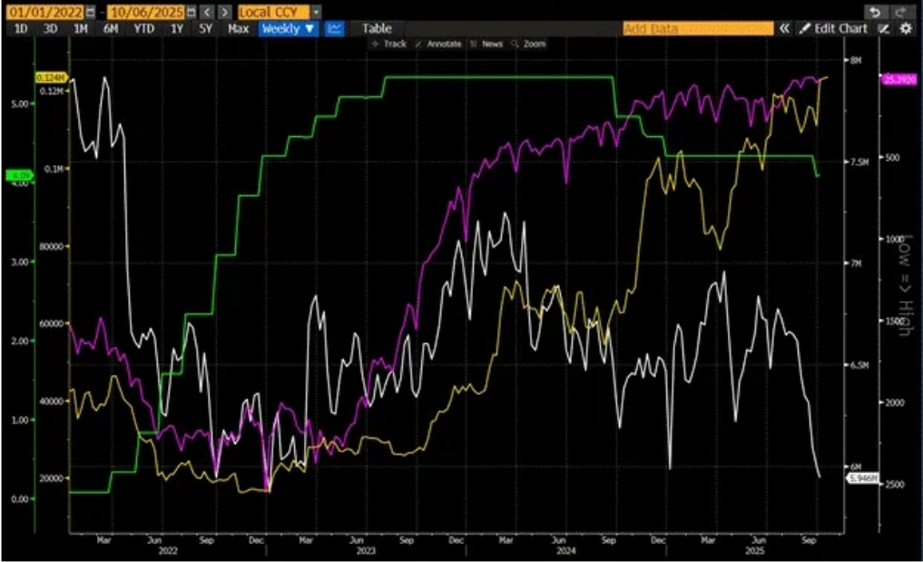 This time, credit growth stems from the Federal Reserve's reverse repurchase agreements (RRP, shown in magenta, with the y-axis inverted). The price of money rises, but supply decreases. However, to stimulate the market, Treasury Secretary Janet Yellen issued more bonds than notes/bonds, depleting the suggested retail price. This injected about $2.5 trillion in liquidity. Her successor, Scott Bessent, continued this practice until today, with RRP nearing zero. China has entered a deflationary phase, with negative credit impulse. President Xi remains focused on curbing the enormous role of housing in the economy. If the policy outlook for the U.S. and China shows no other signals or shifts, I agree with many cryptocurrency traders: the bull market is over. But recent statements and actions from the Federal Reserve and the People's Bank of China suggest otherwise.