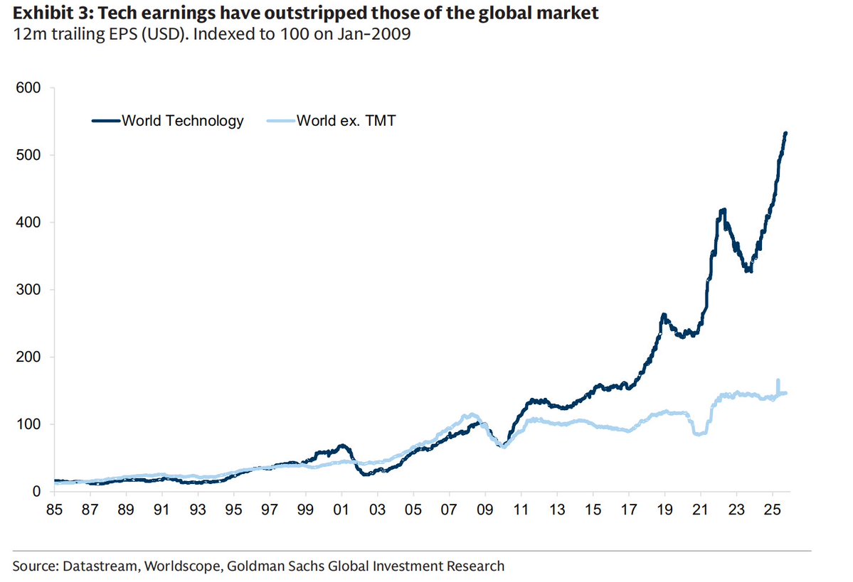 1️⃣ Profit growth vs. speculative trading: This is the most important point. In past bubbles, such as the internet bubble, many companies' stock prices rose based on "irrational" speculation about future growth. At that time, investors rushed into any new company associated with "the internet," hoping to find the next giant. But this time is different; as we often say, the "seven giants" of the U.S. stock market have seen their stock prices rise based on solid and strong profit growth. The profitability of these companies, especially the earnings per share (EPS) in the tech sector, is much higher than in other sectors. As shown in the chart below, the profit growth curve of tech companies is "leaps and bounds ahead."