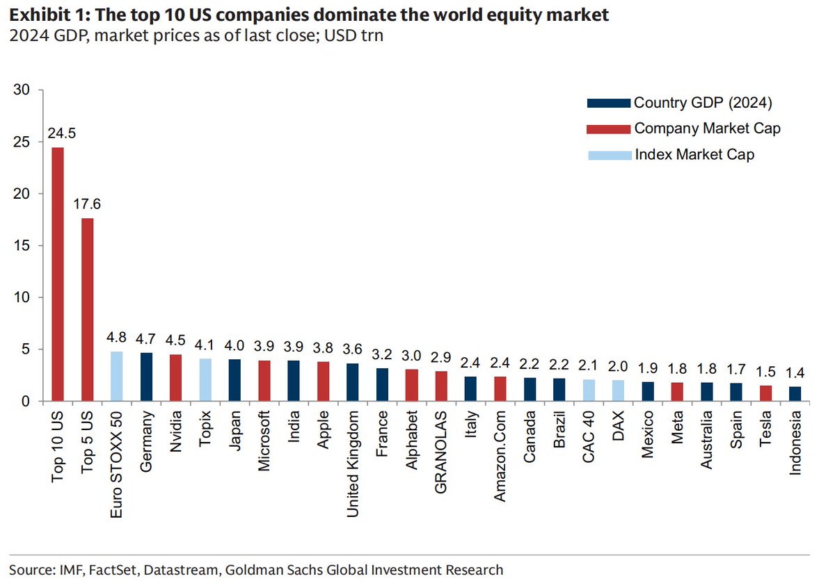 2️⃣ Market concentration is too high (as shown in the chart): Currently, in the U.S. stock market, especially in the global market, a few leading tech companies hold too much weight. The top 10 tech stocks in the U.S. (including Nvidia, Microsoft, etc.) account for nearly 25% of the global stock market value, totaling $25 trillion, which exceeds the combined GDP of the Eurozone, the UK, Japan, and other economies. The performance of these companies has a decisive impact on the entire market index. Although there have been many periods of high market concentration in history, and not all ended with a bubble burst, this extreme concentration itself is a risk; if these companies encounter problems, the entire market will be affected.
