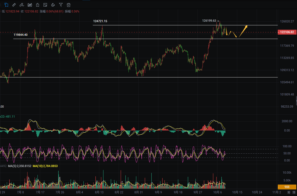 Currently, everyone is very concerned about the future trend after this pullback. Yanling believes that a pullback in an upward trend is normal. The rise during the National Day week has accumulated a space of $12,000, and the news of Middle East peace talks has negatively impacted risk-averse sentiment, intensifying short-term pullback pressure. However, a pullback in an upward trend should first be viewed as a correction rather than a trend reversal—correction refers to a rebound after a decline, while a trend reversal means no recovery after a decline. Previously, the price around 126,000 faced pressure and fell back twice but was still reclaimed by bulls, indicating ineffective declines that did not change the upward rhythm. The current pullback should also be defined as a correction in the upward journey. Currently, in the MACD hourly chart, both DIF and DEA are operating below the zero axis, and the MACD histogram continues to show increasing negative values, indicating short-term bearish dominance but with signs of weakening. The RSI hourly value is 44.98, not entering the oversold zone but below 50, indicating a weak market sentiment. In the EMA hourly chart, EMA7 < EMA30 < EMA120, with short-term moving averages forming a death cross and diverging downwards, indicating a bearish short-term trend; however, the price is close to EMA120, which provides support, and the long-term bullish trend has not changed.