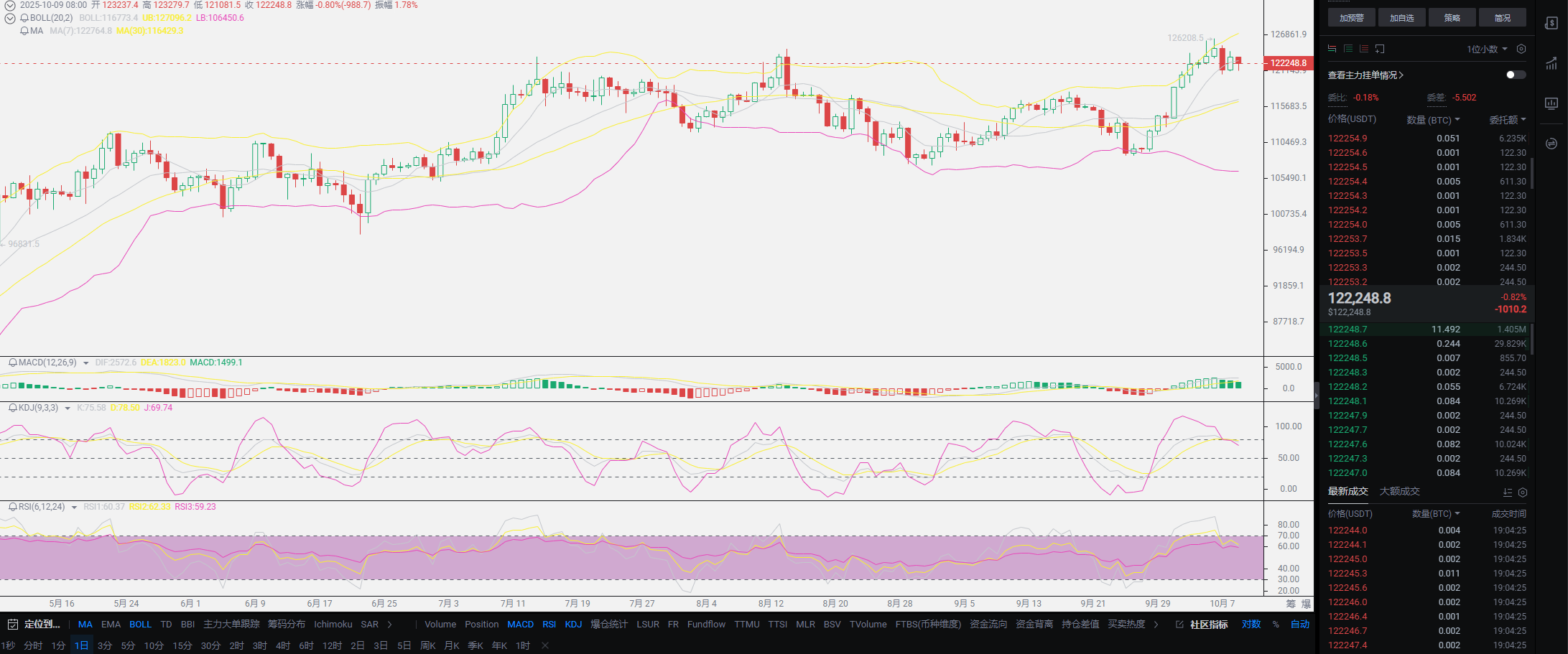 Lao Cui summarizes: At the end of the article, I will make a simple prediction. The timing of Bitcoin's current launch was from the new low of around 107200 at the end of August to early September, reaching a new historical high of 126200; the overall growth is nearly 20,000 points, coinciding with a cyclical high pullback. According to our logic, if we can accept a 20,000 point upward movement, we must at least accept a 10,000 point downward space. The current decline is less than half of the previous growth, which only indicates that the trend has not turned. It remains in an upward trend, and moreover, Bitcoin's indicators are continuously breaking new highs. As long as it is in a state of continuously establishing new highs, we must prepare for the pressure of each new high. Therefore, for contract users, the approach should be to prepare to enter long positions during the pullback phase after a new high is established, rather than chasing the high during the growth process. These are two different trading methods. What we pursue is right-side trading, not left-side trading; left-side trading is the form pursued by spot trading, buying low to do T. Everyone should not confuse spot with contracts; the current downward movement is the entry point for contracts; chasing long is the floating profit for spot, the averaging down point. The decline will not be too far; there is no need for everyone to worry.