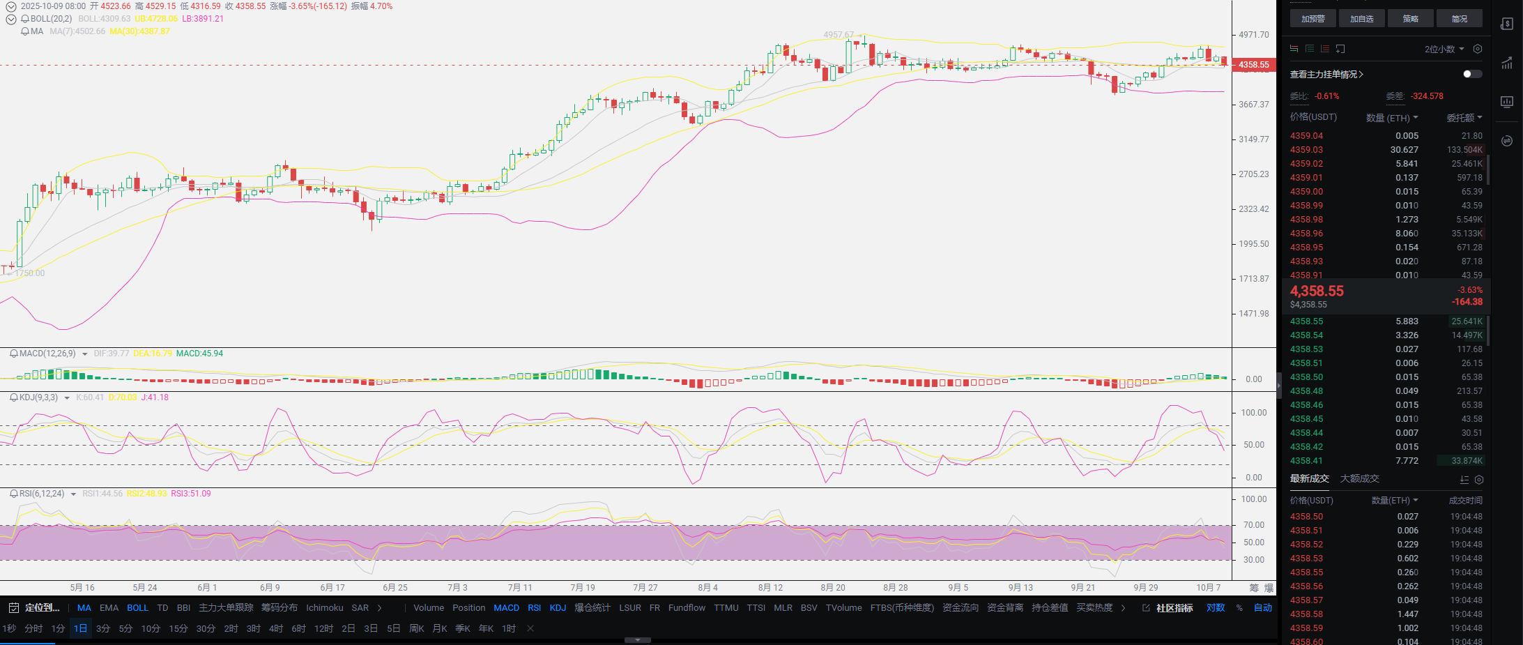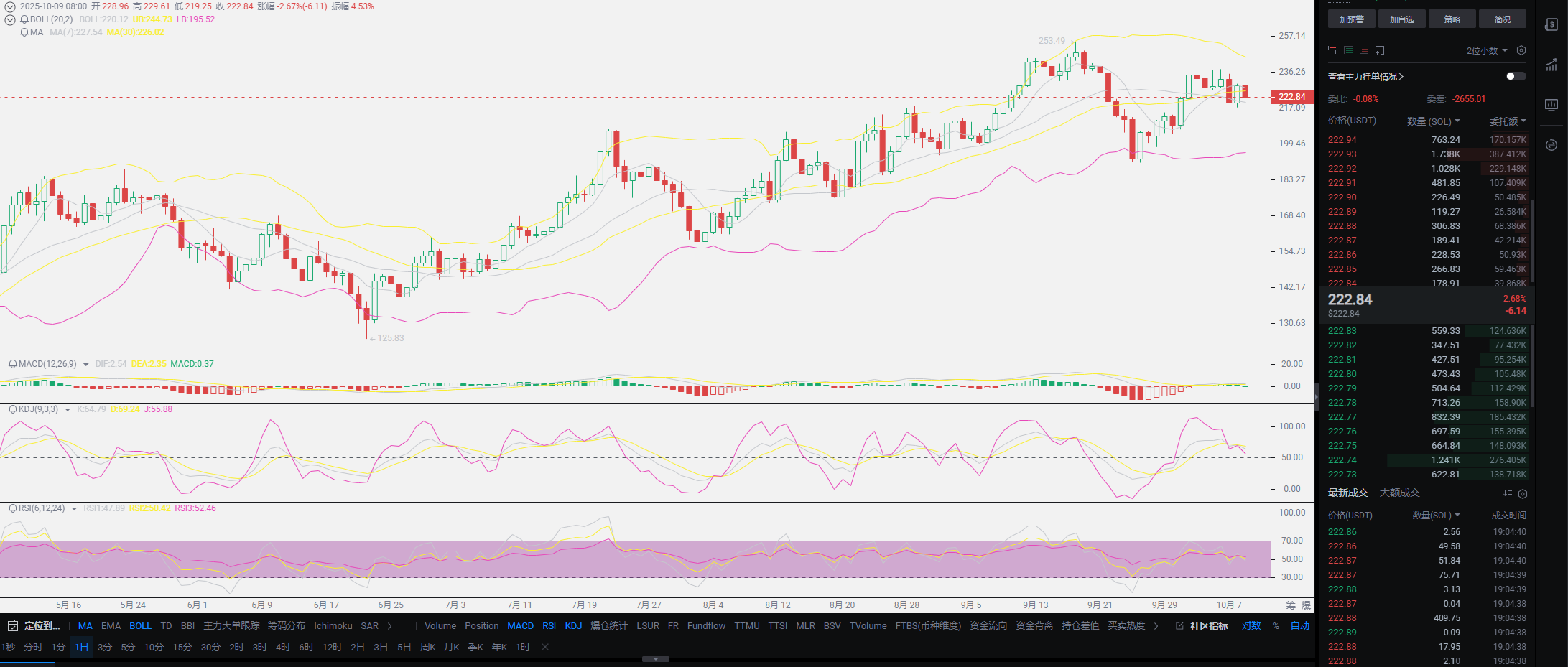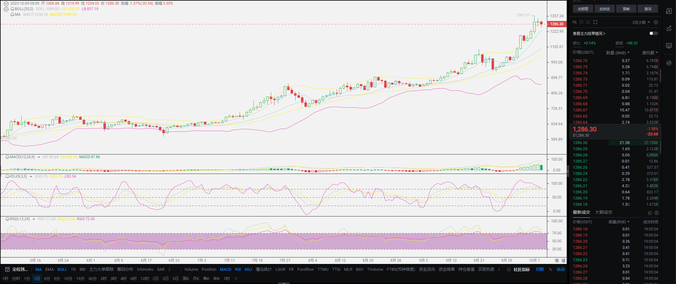 Regarding the short-term decline, Lao Cui feels there is not much volatility, and it does not impact our spot users. At least the current price is still at the high point of September. This dip does not mean a trend reversal; such historical-level pullbacks are still considered normal. I have taught everyone how to judge trends before; the first thing to look at is the leader, and currently, the leader is undoubtedly BNB. The depth of the pullback is only from 1362 to the current 1279, which is less than 10% overall, and the trend remains in a bullish phase. Based on the current downward trend, if the author has not entered the market, this dip will be my entry point and also a position for averaging down. We are already approaching mid-October, and the next interest rate cut is about a week away. The closer it gets, the greater the volatility, and this dip is also a preparation for the October interest rate cut, which is an undisputed trend.