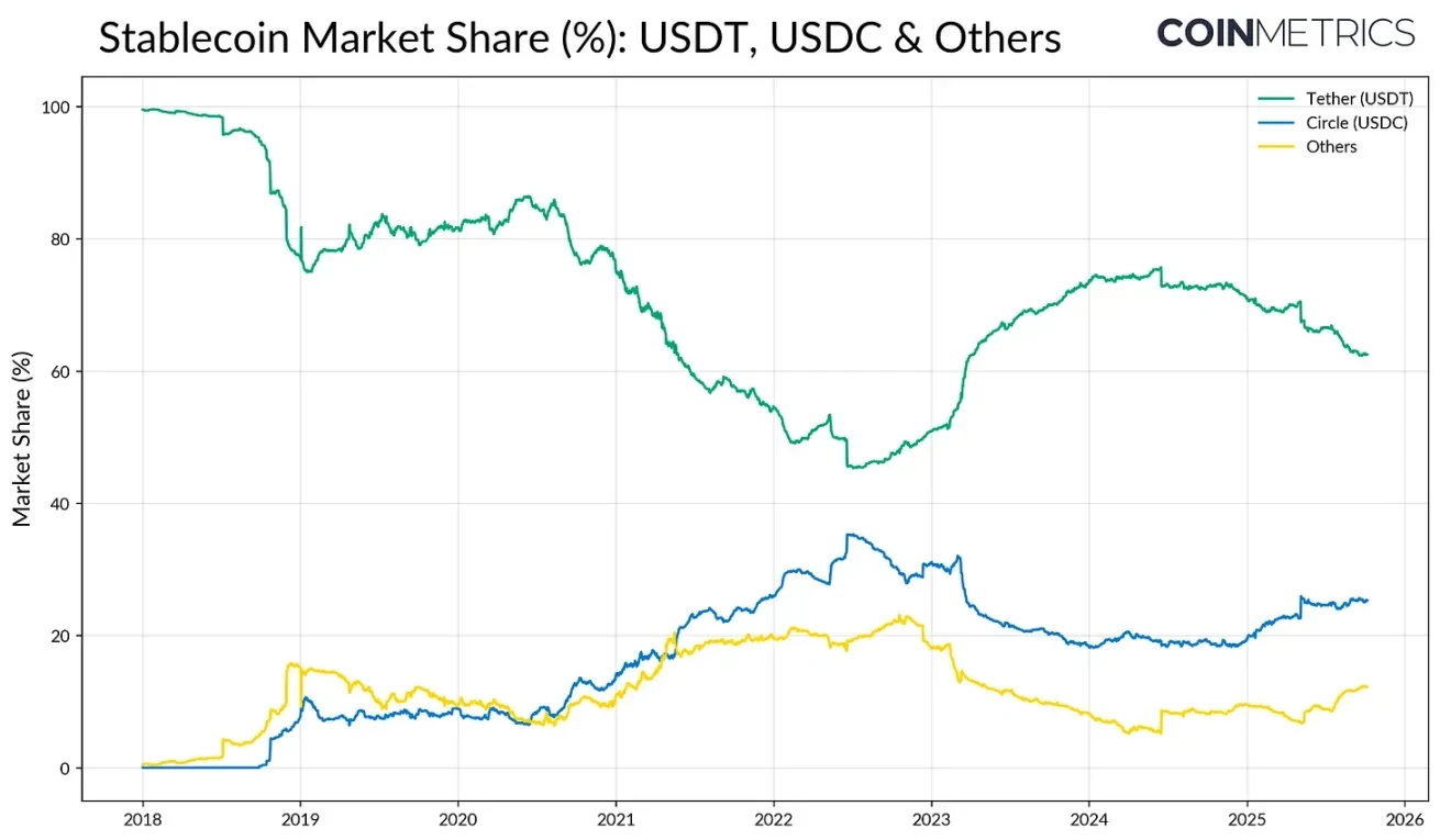 Circle's USDC has gradually regained its footing, driven by domestic regulatory momentum, while "other" stablecoins, primarily interest-bearing alternatives like Ethena's USDe, Sky's USDS, and tokenized money market funds, are gaining market share. The market currently seems to be in a transitional phase, with USDT continuing to lead in liquidity and adoption but facing increasingly fierce competition from existing payment networks entering the market and alternatives distributing yields.