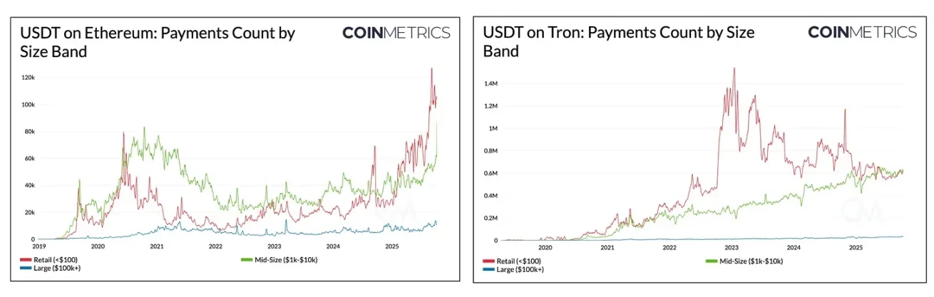 This trend is also evident in the composition of cross-blockchain USDT payments. On Tron, as medium-scale traffic momentum increases, the gap between retail payments and medium-sized transfers has narrowed. On Ethereum, since 2024, the number of retail ($100) and medium-sized ($1,000 - $10,000) payments has surged, while large ($100,000 - $1 million) transfers have remained stable. This indicates that as the network becomes more accessible, the use of USDT is diversifying towards smaller-scale activities.