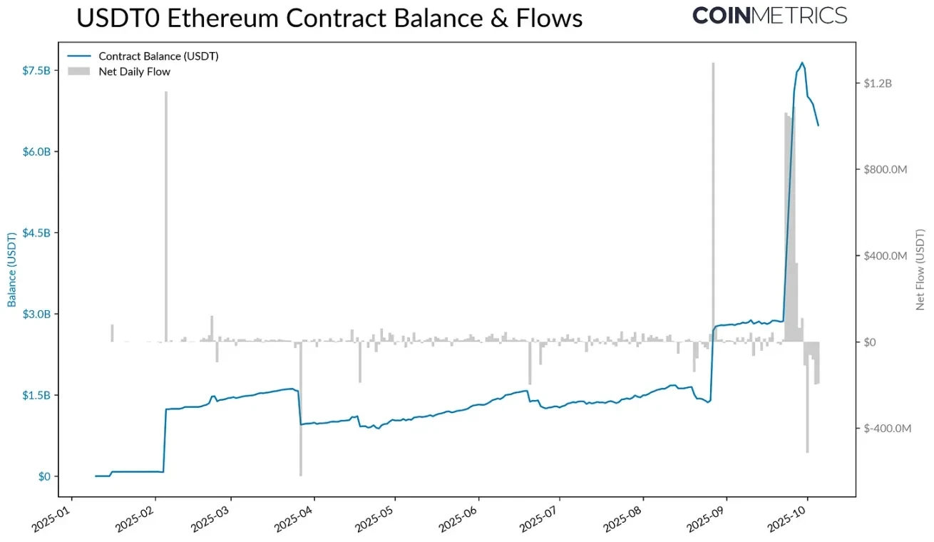 After the launch of Plasma (a Layer-1 blockchain optimized for stablecoins) on September 25, the USDT supply locked in the USDT 0 Ethereum contract surged from $2.8 billion to $7.7 billion. With zero-fee USDT transfers, stablecoins as fuel fees, and high throughput design, Plasma quickly attracted over $6 billion in USDT 0 supply, currently stabilizing around $4.2 billion.