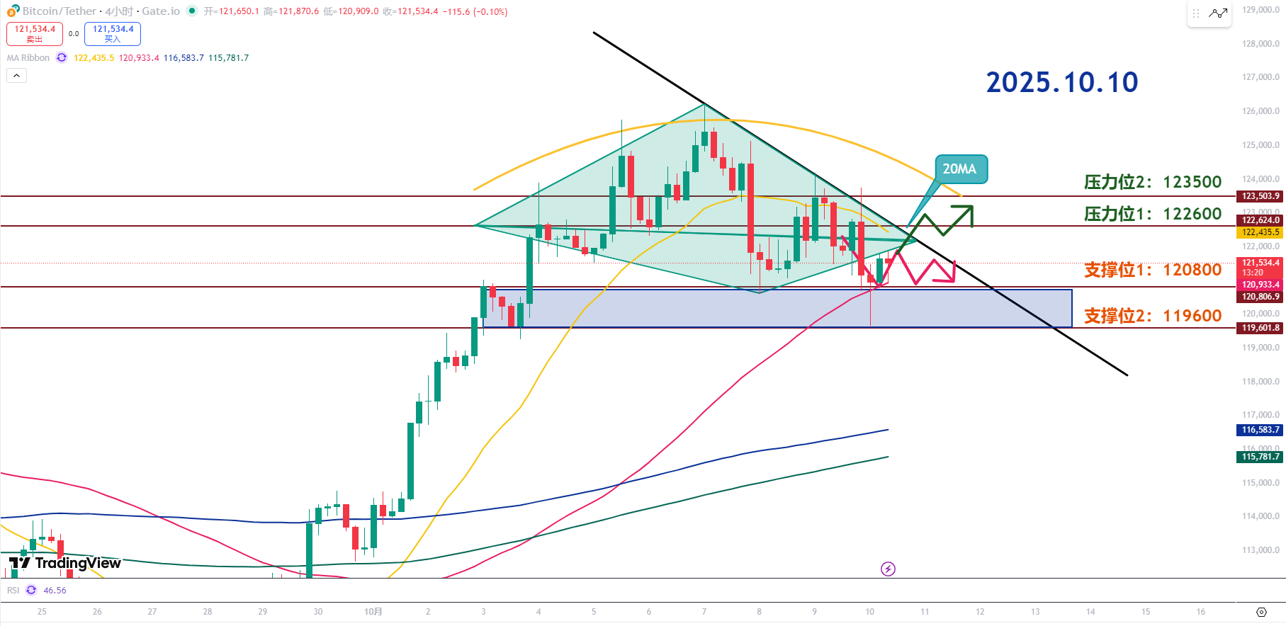 Today's key point is the strength of the rebound. If it can stabilize and rise above 122.6K to 123.5K, there is still a chance for continued upward movement. However, if the rebound is weak, it will have to drop further, possibly testing the range of 120.8K to 119.6K again.