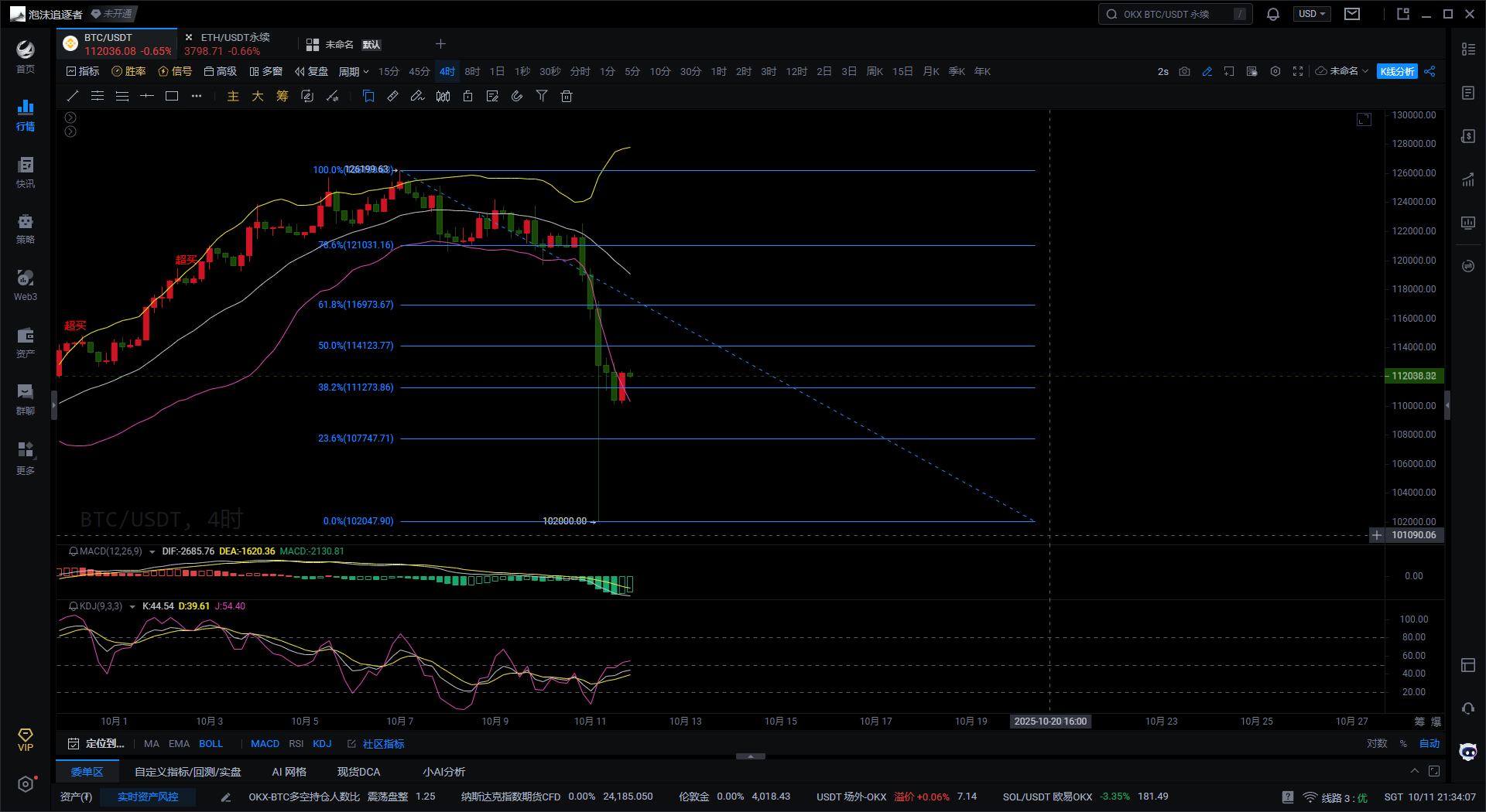 The current price range shows a high point around $126,200 and a low point at $102,000. According to Fibonacci retracement analysis, 23.6% corresponds to $107,747, 38.2% corresponds to $112,723, 50% corresponds to $114,123, and 61.8% corresponds to $116,973. The current price is around $112,000, which is just near the 38.2% retracement level, marking the first key resistance area for a rebound. If the price cannot effectively break through the $112,700-$114,000 range, the rebound may end, and the price may continue to oscillate weakly.