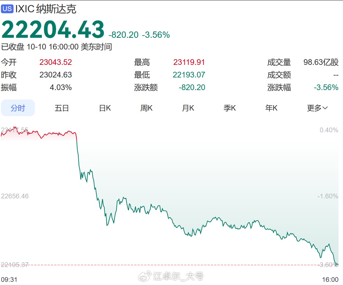 On October 10 at 10:57 PM (Beijing time, same below), Trump claimed on Truth Social that he would significantly increase tariffs on China, causing a sharp drop in U.S. stocks (11 PM to 4 AM) similar to the tariff war in April, with the Nasdaq dropping 3.56% in a single day.