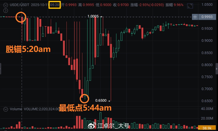 ① USDe/USDt decoupled at 5:20 AM (the lowest point for BTC and ETH) and gradually fell to a low of 0.65 at 5:44 AM. (USDe is a synthetic stablecoin, with a total market cap only behind USDT and USDC, relying on holding ETH + opening equal short positions on exchanges to gain arbitrage profits)