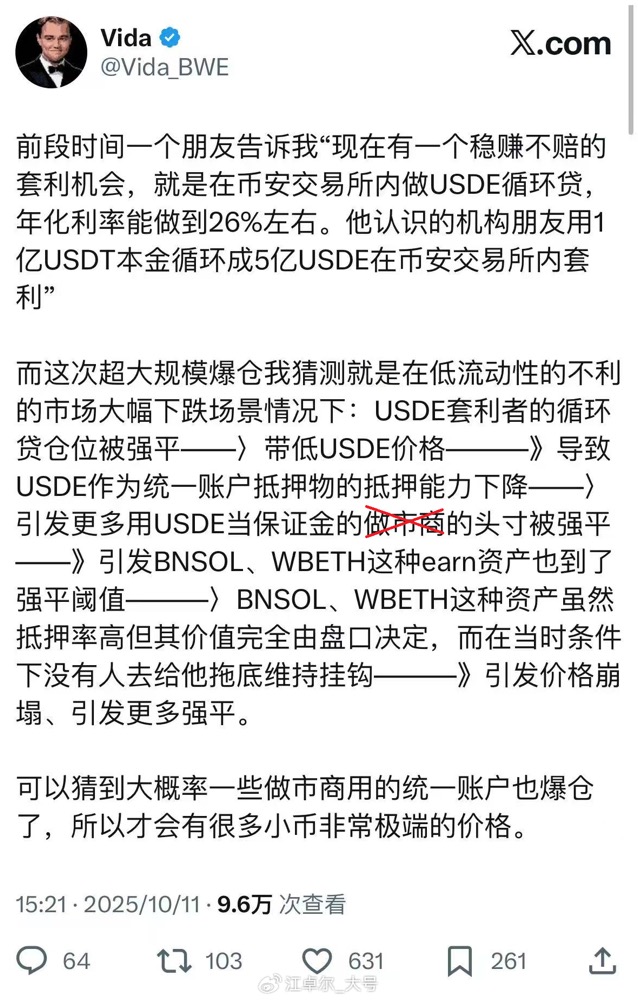 Especially those who used ETH/SOL to collateralize wbETH/bnSOL, then borrowed USDT with wbETH/bnSOL, and then exchanged for USDe for circular loans. After USDe dropped to 0.65, the overall collateralization rate was insufficient, leading to forced liquidation of their entire accounts.