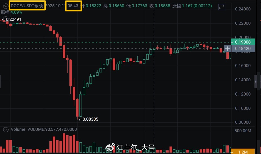 If it were the market makers/arbitrageurs trading cryptocurrencies, since they all hedge futures against spot, for example, when the funding rate is positive, going long on spot/shorting futures to earn the funding rate, once a large market maker/arbitrageur is liquidated, there would inevitably be abnormal movements in altcoins (reverse movements in spot/futures). However, at 5:43 AM, there were no such movements, as seen in the case of DOGE spot/perpetual futures: