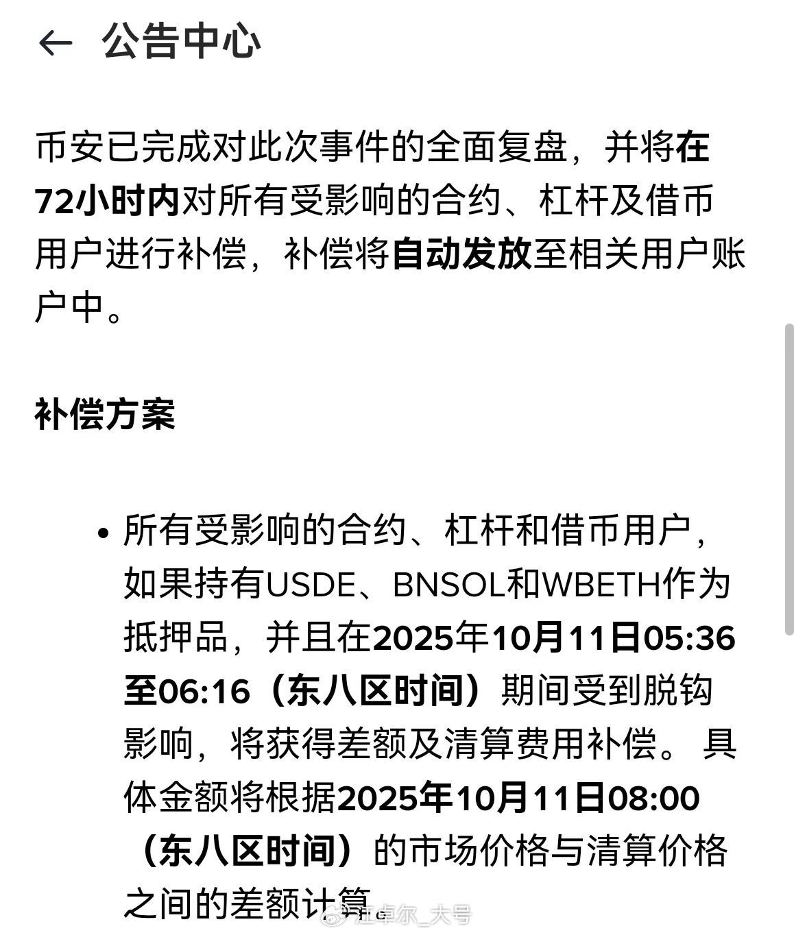 Binance's compensation for the losses from abnormal trading of USDe, wbETH, and bnSOL (compensating the difference between the low selling price and the trading price at 8 AM on the 11th) is commendable, but the measures taken are not sufficient to completely prevent future decouplings. It is recommended to set a hard floor for the ETH/SOL exchange rate when calculating value (for example, 0.8).