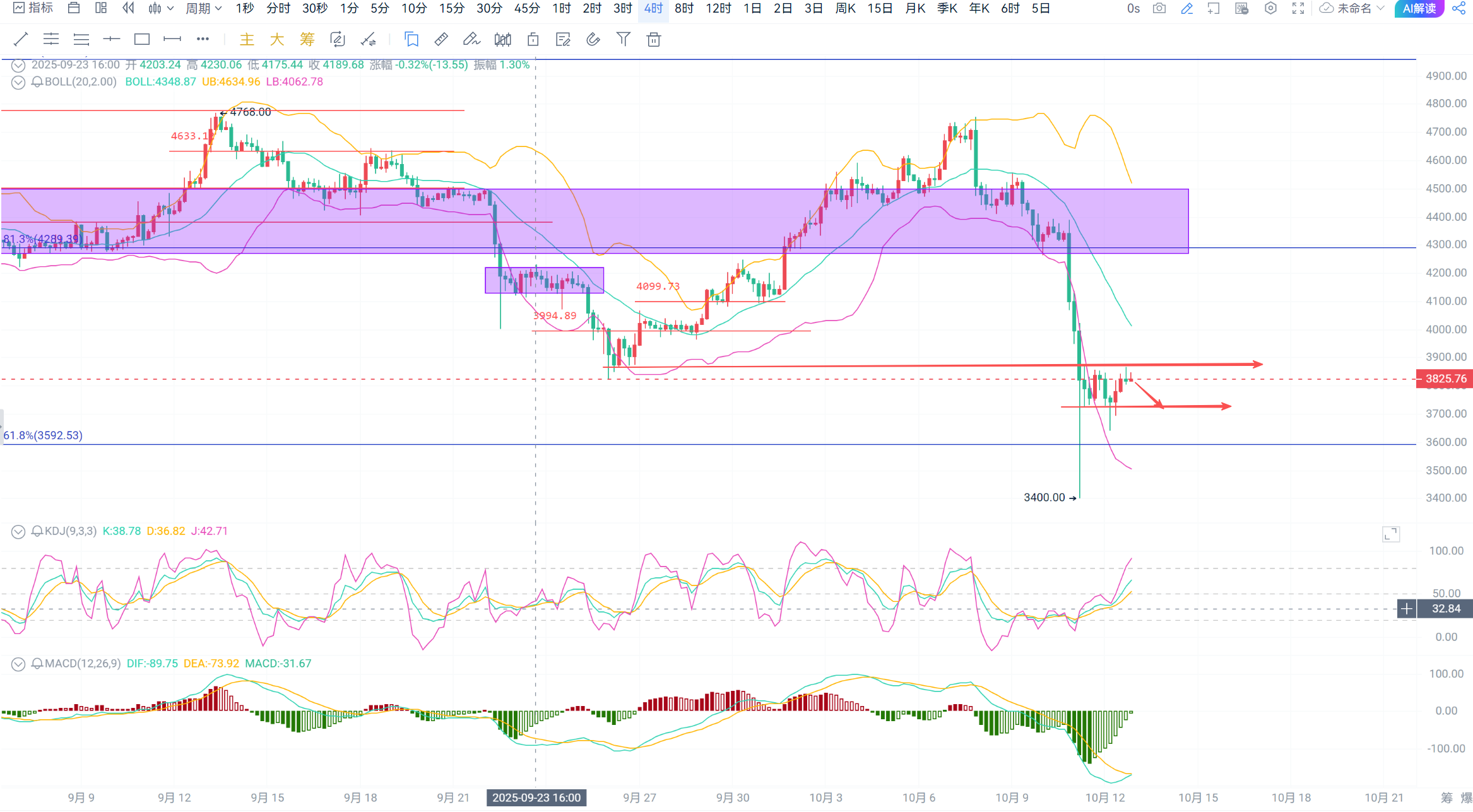 For Ethereum, the daily candlestick closed as a bearish candle around 3745, the Bollinger Bands continue to slowly open downwards, the MACD moving average continues to move downwards, bearish volume continues to increase, and the KDJ line continues to move downwards. On the 4-hour chart, the Bollinger Bands continue to slowly open downwards, the MACD moving average starts to run parallel, bearish volume continues to decrease, and the KDJ line begins to move upwards;