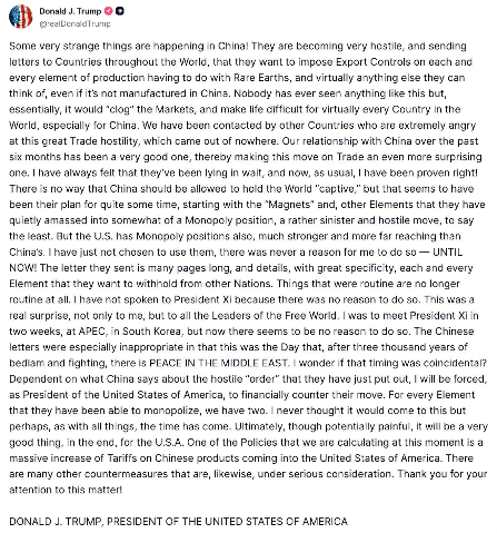 Starting November 1, the U.S. will impose an additional 100% tariff on all imported goods from China. U.S.-China relations have deteriorated to the point where face-to-face meetings are unnecessary; we will retaliate comprehensively through financial and trade means. China's monopoly on rare earths leaves us no choice; this is to protect America's core interests.