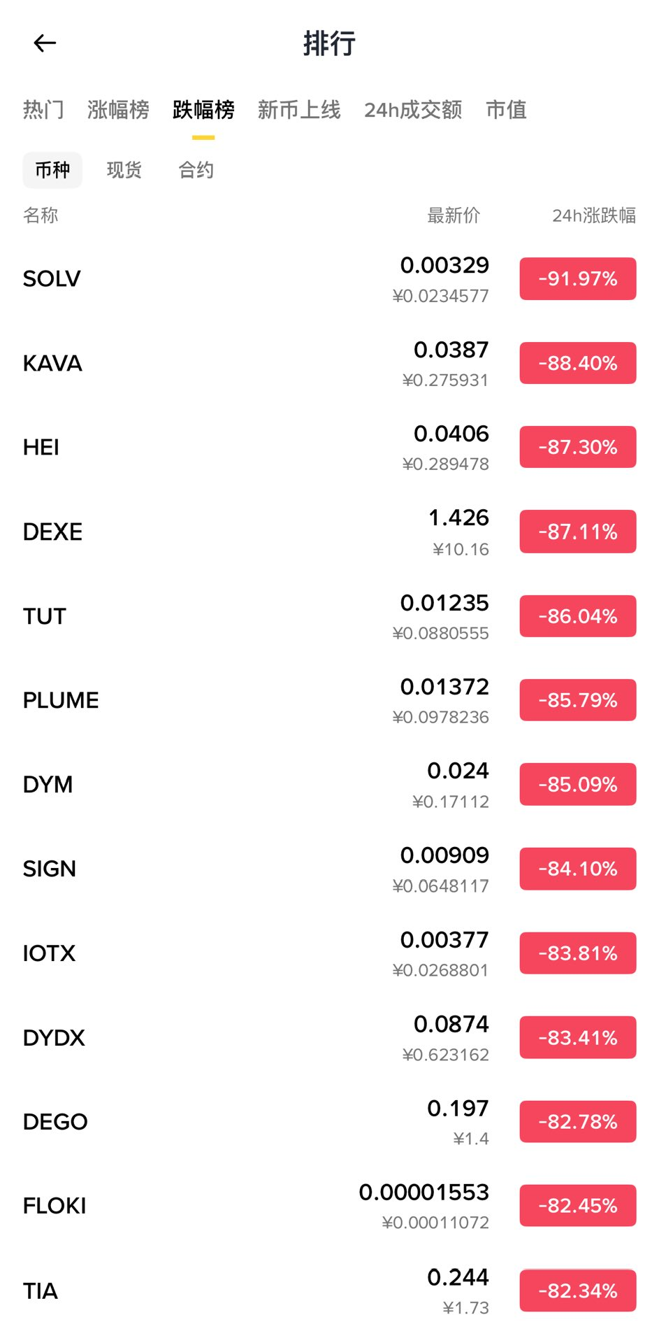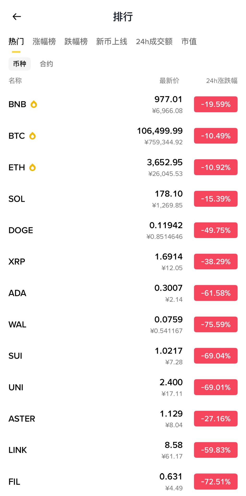 Shortly after the tweet, Bitcoin began its free fall, crashing from a high of $119,000 to below $102,000 within hours, with a single-day drop exceeding 14%. Ethereum fared even worse, collapsing by 24%; SOL plummeted by 25%, BNB fell by 33%, and mainstream altcoins like XRP, DOGE, and SHIB saw average declines of 60% to 80%. Some illiquid small coins even dropped over 90% within minutes. The liquidation pressure was so intense that even a 1x leverage position was wiped out.