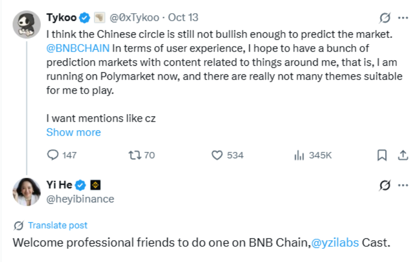 ● Core content of the post: On October 13, 2025, Binance co-founder He Yi responded to @0xTykoo on the X platform regarding discussions on the localization of prediction markets, stating: “Welcome professionals to create one on the BNB chain, @yzilabs investment.” This brief reply quickly garnered thousands of retweets, igniting interest in the BNB Chain prediction market sector.