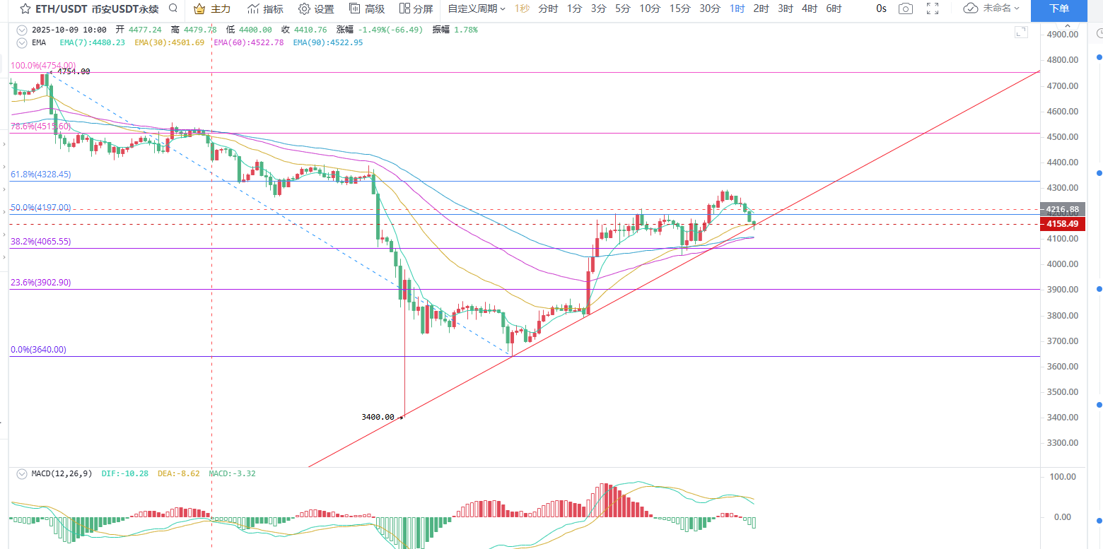 From the chart, the market has reached a critical position. If it holds, it will confirm around the 4250 area; if it doesn't hold, a conservative estimate would be around 4050. In terms of technical indicators, Ethereum is currently trading above the 60-day and 90-day moving averages on the hourly chart, so I think it's normal to see some fluctuations here. Additionally, there hasn't been any significant change in volume, so in the absence of obvious changes, we can maintain our previous view. Currently, I plan to continue holding; as for you, you can decide for yourself. After all, I can adjust based on market changes at any time, so everyone can decide based on their own situation whether to take profits or move stop-losses to secure gains.