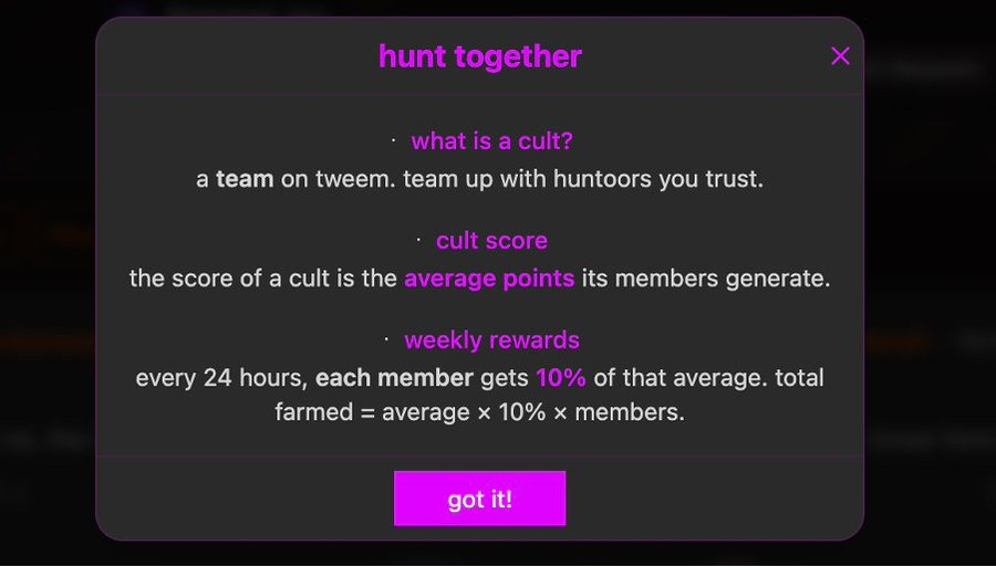 Additionally, Tweem offers a feature called "Cult" (team), allowing users to team up with other content hunters to find high-quality content. Team members can share points equally. This could form a kind of "content guild" focused on curating specialized content on specific topics. For example, there could be teams "Cult" focused on the best memes, best macro analysis, or best prediction market insights.