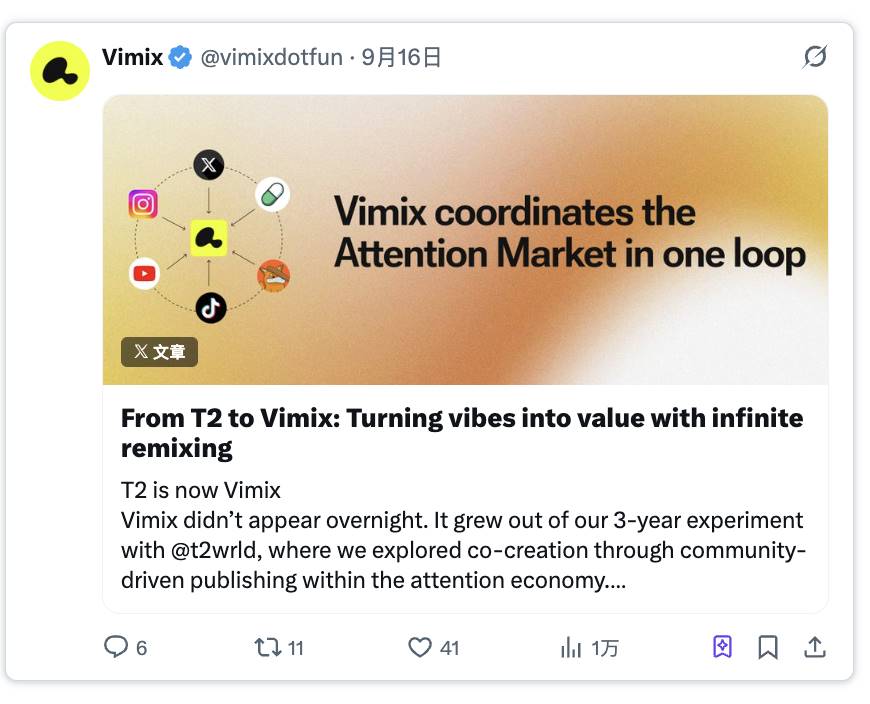 Vimix is a protocol that hopes to become the "Attention Market Coordination Layer," with the core idea of building a market for a specific, high-value curation task—content remixing.