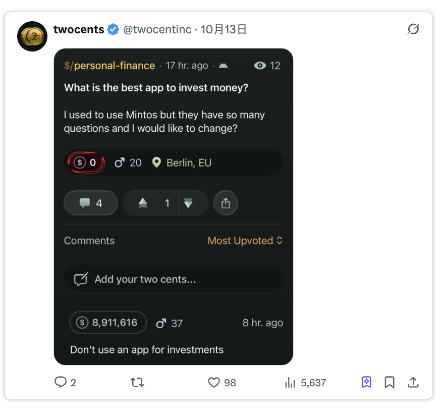 The platform does not focus on a single topic; users can discuss a variety of content from investing to dating, but always against the backdrop of their verified financial status.
