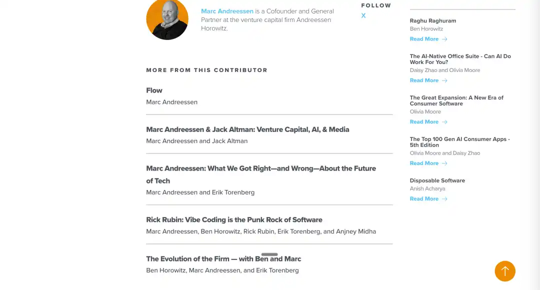 From the 2011 article "Why Software Is Eating the World," to the 2020 piece "It's Time to Build," and then to the 2023 articles "Why AI Will Save the World" and "The Techno-Optimist Manifesto," almost every article Marc writes sparks industry-wide discussions.