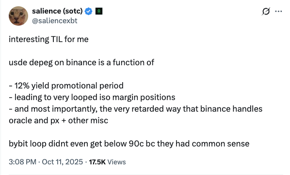 The most notable point is that the de-pegging of USDe on the Binance platform was more severe than on Bybit, causing considerable pain for Binance users.