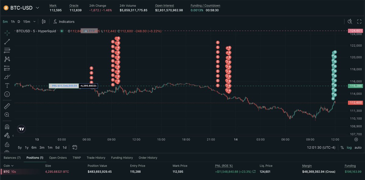 The $10B Hyperunit whale is currently reducing his shorts. He has currently closed out $15 Million of his shorts, leaving $478M of shorts currently open.
