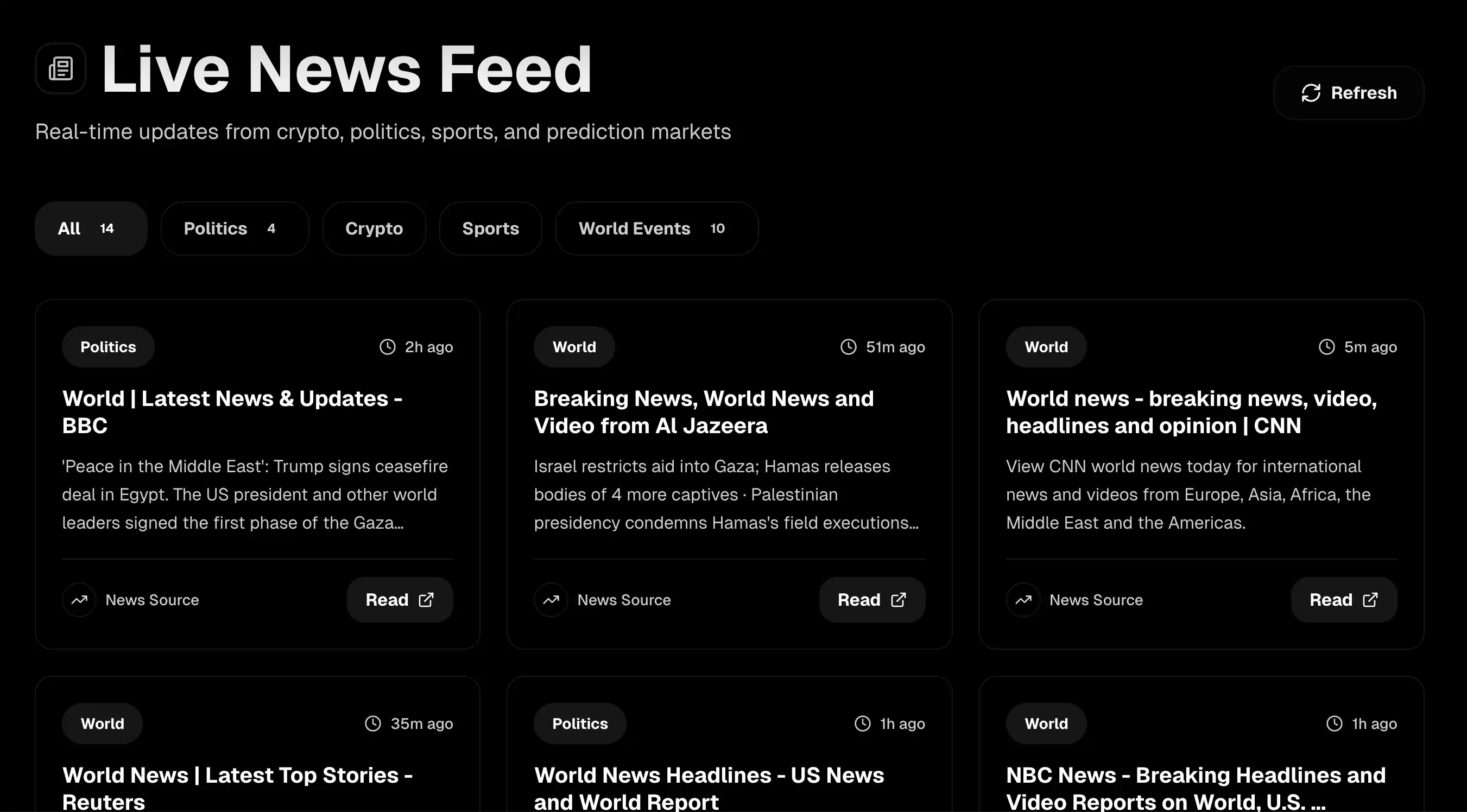 To date, the Polyfactual official website has integrated an AI news feed that tracks developments in fields such as crypto, politics, and sports, filtering out key messages related to Polymarket markets. Users can browse the Live Feed on the website for news summaries or use the aforementioned browser extension to view AI interpretations in the sidebar of the Polymarket webpage.