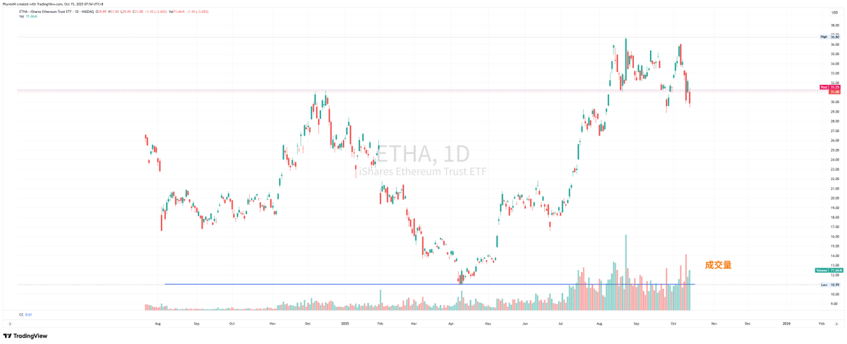 The same situation can be seen with $ETH, which is also similar. Although there has been a large amount of selling in the primary market for ETH spot ETFs, the performance in the secondary market is still acceptable. The trading volume of $ETHA in the secondary market is quite large, but when compared horizontally with BTC in terms of capital, ETH's data is still significantly lagging behind BTC.