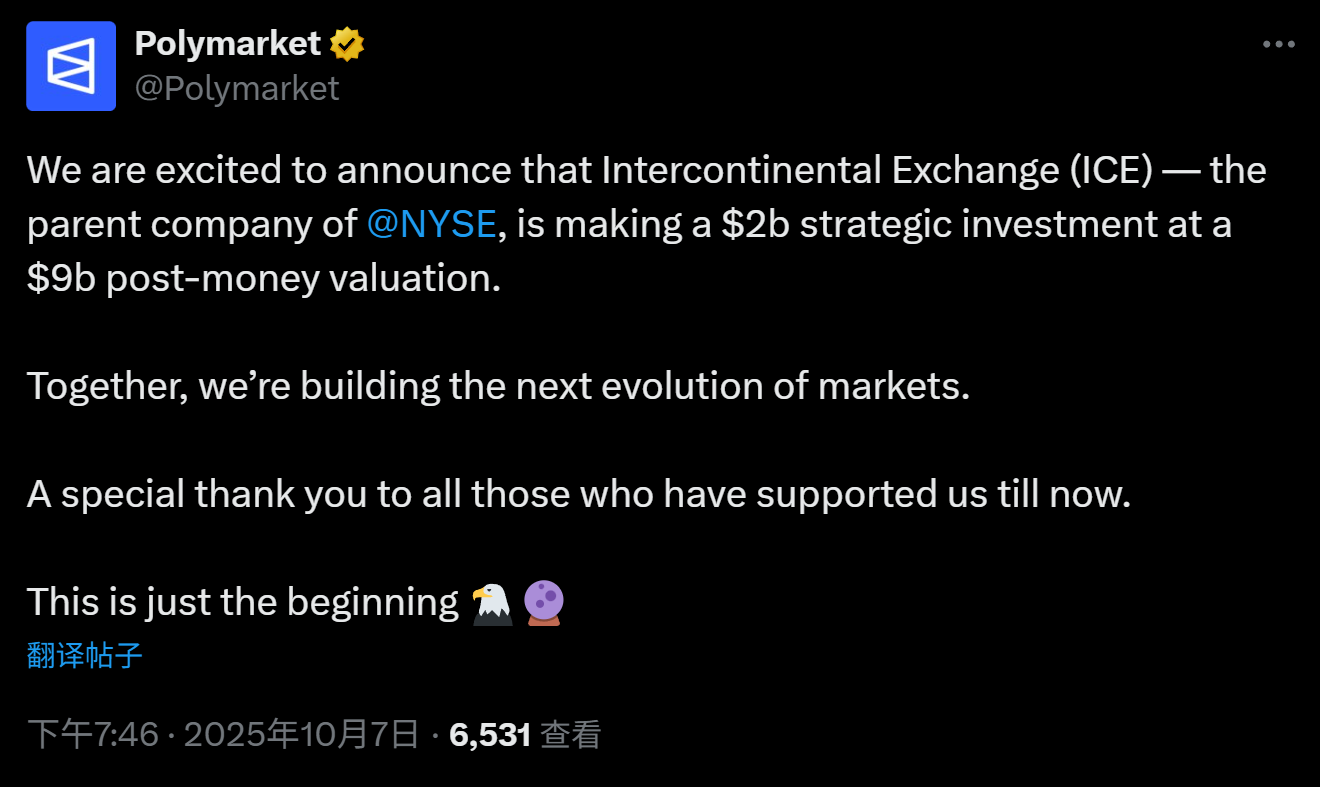 On October 7, 2025, the prediction market Polymarket announced that the parent company of the New York Stock Exchange, Intercontinental Exchange (ICE), would make a strategic investment of $2 billion, with a post-investment valuation of up to $9 billion. This is not only one of the highest amounts of financing received by projects in the Web 3 space in recent years but also brings the potential and popularity of prediction markets to the forefront.