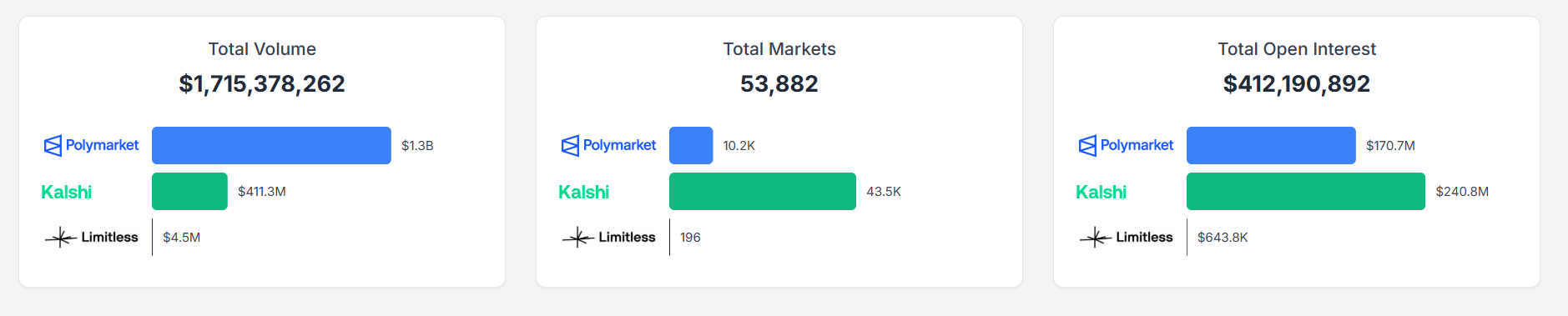 As of October 10, 2025, comparing the data from Polymarket and Kalshi, aside from the total trading volume where Polymarket significantly outperformed with $1.3 billion vs. $410 million, Polymarket is lagging behind Kalshi in terms of the number of markets (10,200 vs. 43,500) and open contract volume ($170 million vs. $240 million).