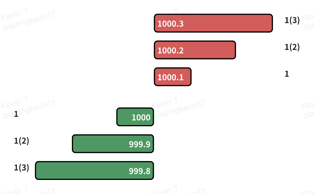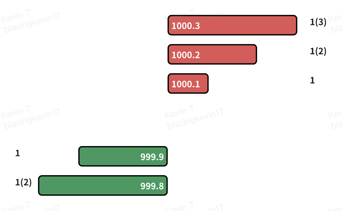 • Asks: Densely distributed at price levels of $1000.1, $1000.2, $1000.3, etc.