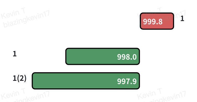 Through the above operations, the market maker successfully reduced the breakeven point of its long position from $999.9 to $998.9. Based on this lower cost basis, the market maker can now more aggressively seek selling opportunities. For example, it can significantly lower the sell quote from $998.8 to $998.9, achieving breakeven while narrowing the spread from the previous $1.8 ($999.8 - $998.0) to $0.8 ($998.8 - $998.0) to attract buyers.
