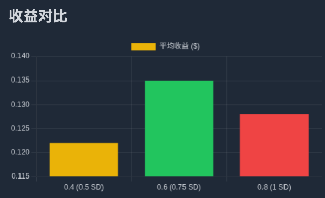 • C. Finding the Optimal Solution: By iteratively calculating different spreads, we find that: a spread of $0.2 has an expected return of about $0.08; a spread of $0.4 has an expected return of about $0.122; a spread of $0.6 has an expected return of about $0.135; and a spread of $0.8 has an expected return of about $0.128. The conclusion is that under this model, the optimal spread is $0.6, meaning placing orders at a distance of $0.3 (approximately 0.75σ) from the average can maximize expected returns.