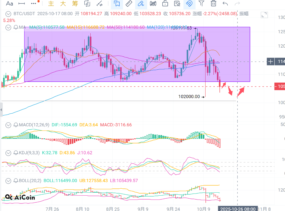 Bitcoin's high yesterday was around $111,982, and the low was around $107,427. Bitcoin has been closing in the red for several days and has now fallen below the previous consolidation range. Today, it reached a low of $103,528, showing weak momentum, and is still in a downward trend in the short term, with short-term attention on the support at the $100,800 level.