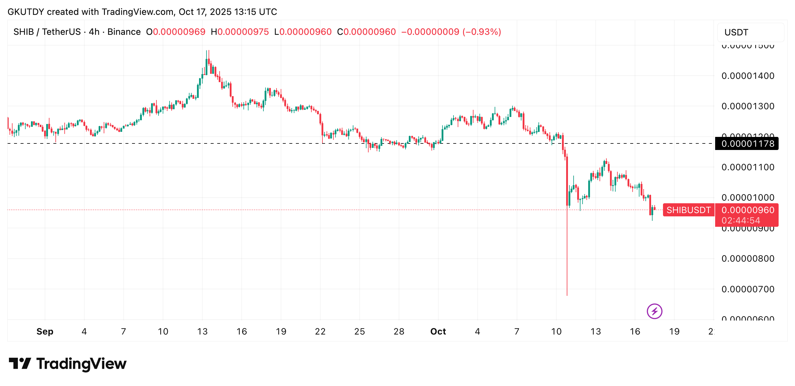 The Shiba Inu coin's price today sits at $0.00000972, just under the ten-thousandth mark. It slipped through the long-standing $0.00001178 support in early October and even printed a deep wick at $0.000006, when liquidity vanished for a moment.