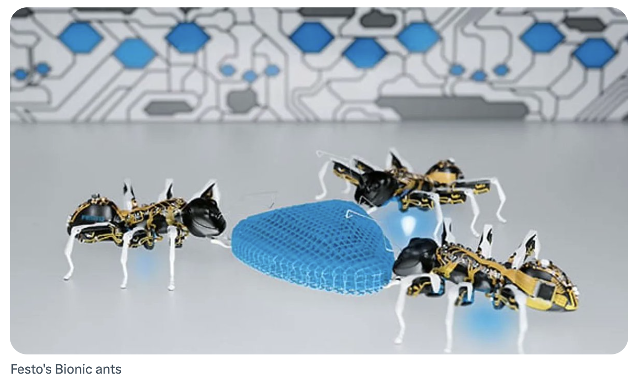 • BionicAnts from Festo: Robotic ants that collaborate using swarm intelligence to complete tasks.