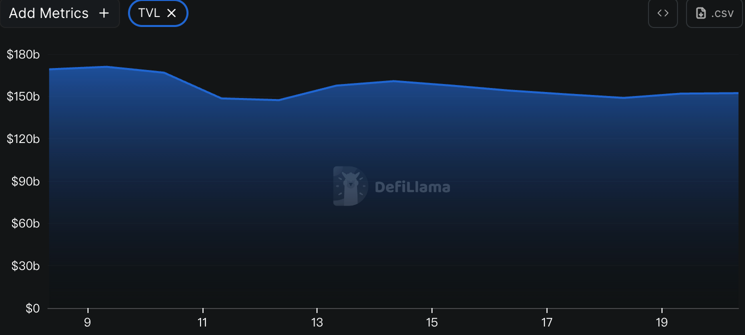 According to data from DeFiLlama, the total TVL of DeFi this week is $152.2 billion, down from $157.4 billion last week, a decrease of approximately 3.3%.
