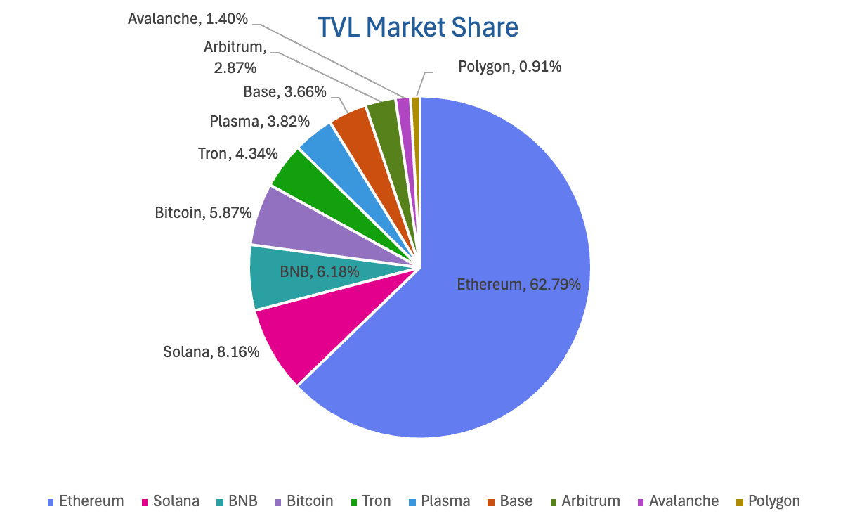 By public chain, the top three chains by TVL are Ethereum, accounting for 62.79%; Solana, accounting for 8.16%; and BNB Chain, accounting for 6.18%.