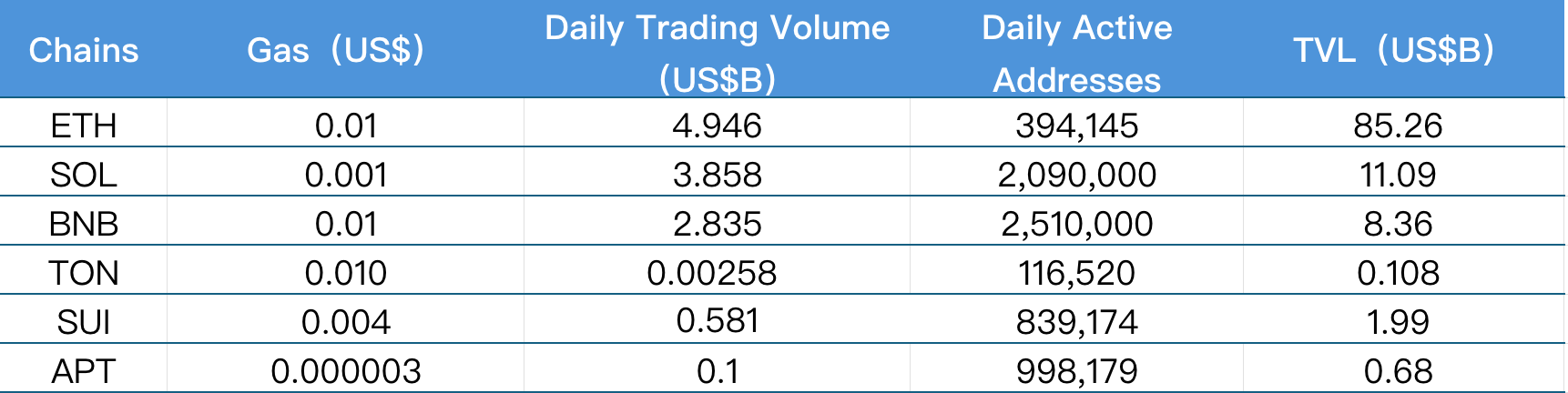 Mainly analyzing daily trading volume, daily active addresses, and transaction fees for the current major Layer 1 chains including ETH, SOL, BNB, TON, SUI, and APTOS.