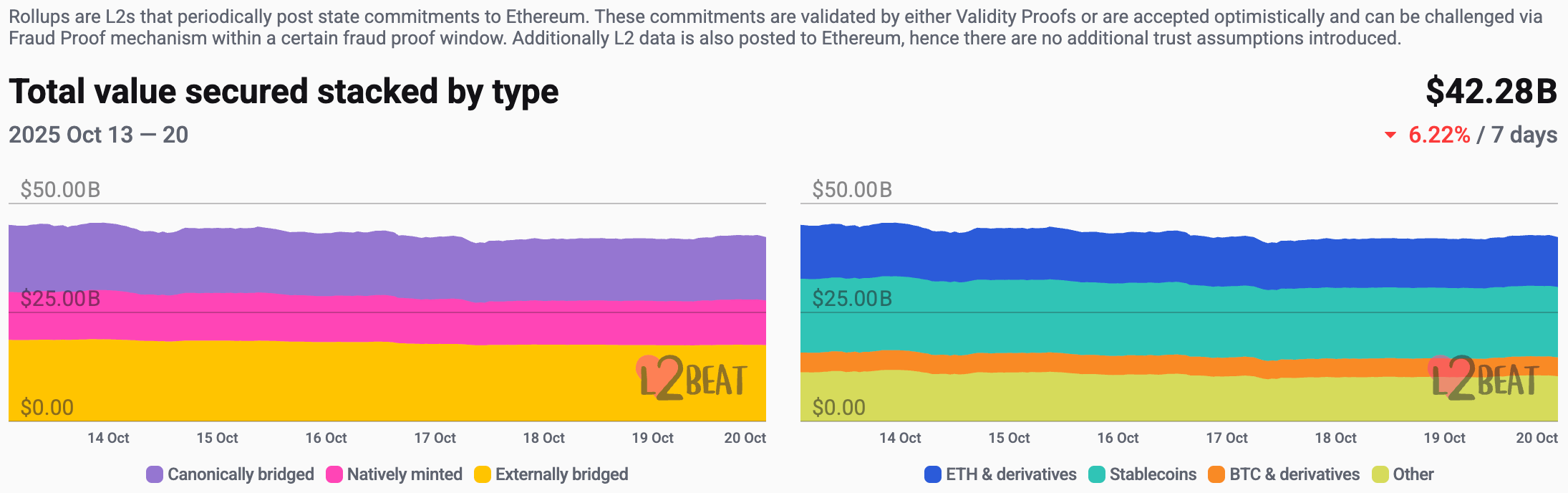 According to L2Beat data, the total TVL of Ethereum Layer 2 is $42.28 billion, down 6% from last week ($44.98 billion).