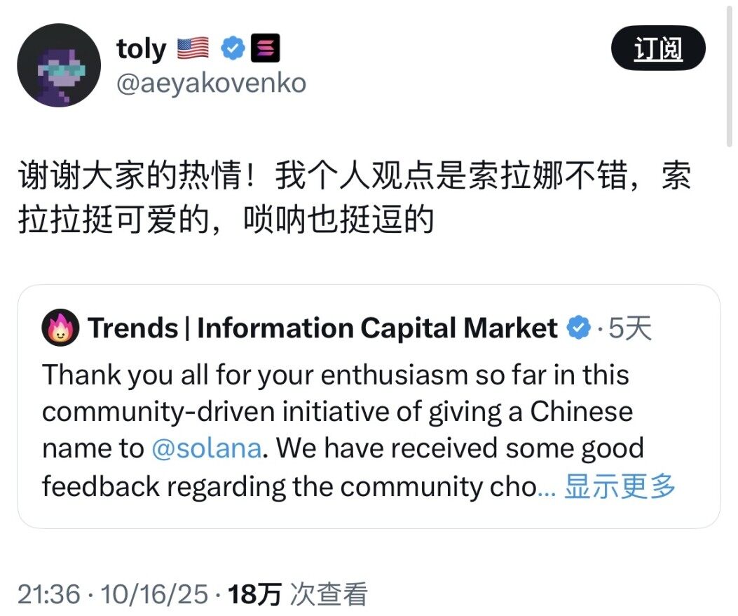 On October 20, Lily Liu replied to muper's tweet with "lovely picture," while changing her profile picture to "索拉拉." That evening, the official Solana account quoted muper's tweet and captioned it "索拉拉," completing the official recognition of this Chinese name.