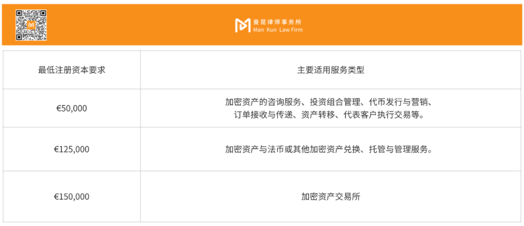 Currently, Poland has not issued secondary regulations regarding minimum registered capital, so MiCA's standards remain the primary reference. Below are the minimum registered capital requirements based on the different service types provided by CASPs in MiCA: