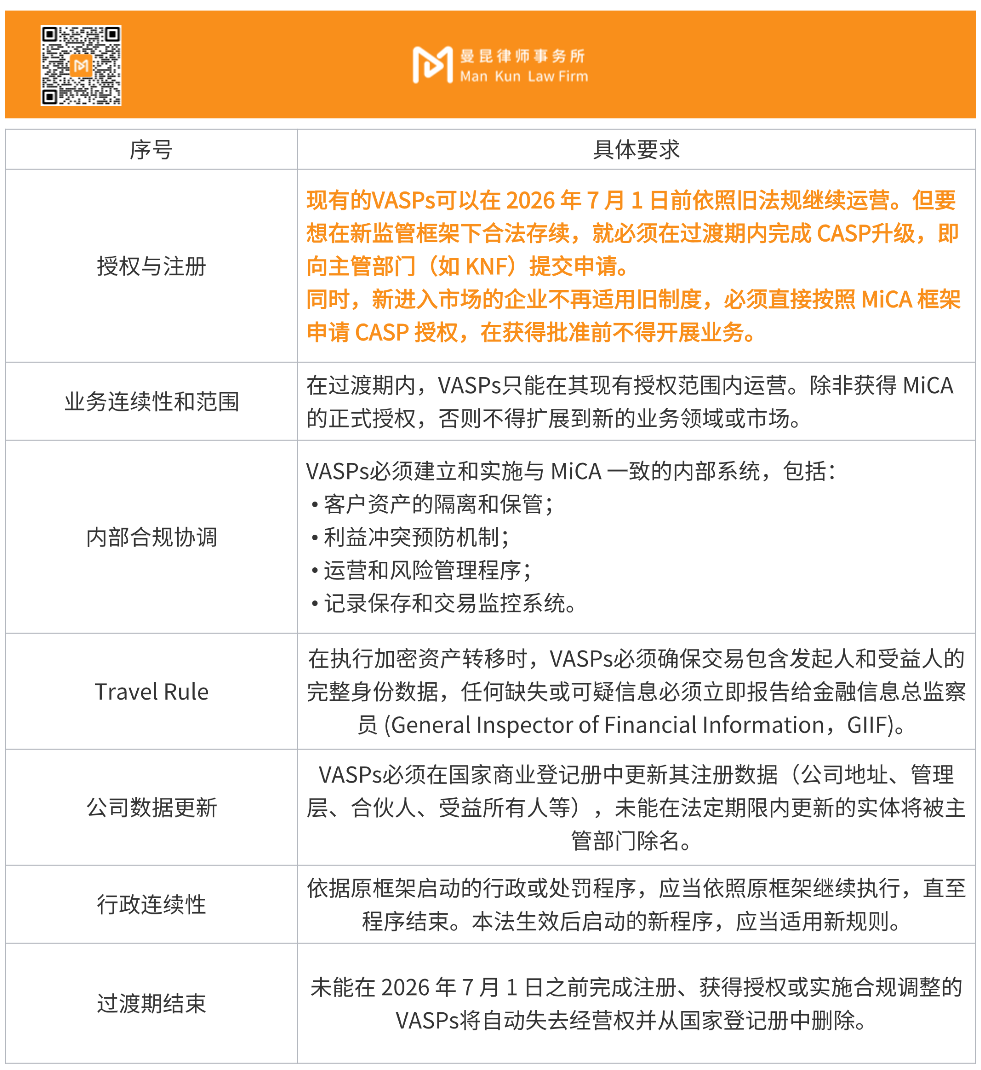 To help the market transition smoothly and avoid operational interruptions, the Act establishes a transition period for existing crypto asset service providers (VASPs): VASPs currently registered under anti-money laundering regulations can continue to operate in compliance with existing rules until July 1, 2026, but must gradually upgrade to the new standards until obtaining CASP authorization or the deadline. Below are the specific requirements for the transition period outlined in the Act, and market participants should also pay attention to the effective date of the secondary regulations accompanying the Act.