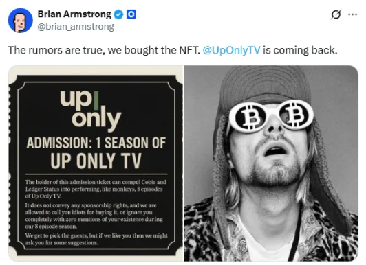 Coinbase CEO Brian Armstrong announced a preheating message on Monday to pave the way for this acquisition: the largest cryptocurrency exchange in the U.S. will relaunch the popular cryptocurrency podcast "Up Only" by Cobie. Coinbase paid $25 million for the NFT representing the rights to relaunch the podcast. The podcast has not updated its content since 2022. Similar to exercising options, to activate this NFT, Cobie needs to produce eight new podcast episodes.