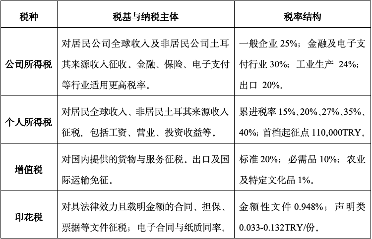 Tax structure: Turkey's overall tax structure consists of direct and indirect taxes—direct taxes include corporate income tax and personal income tax; indirect taxes include value-added tax, special consumption tax, stamp duty, and banking and insurance transaction taxes. Tax revenues are managed uniformly by the Ministry of Finance according to the Public Financial Management Law (Law No. 5018) and are distributed to local governments and social security institutions.