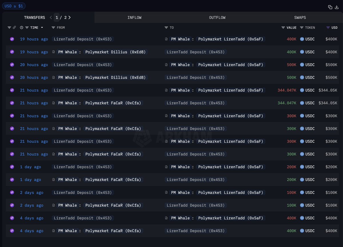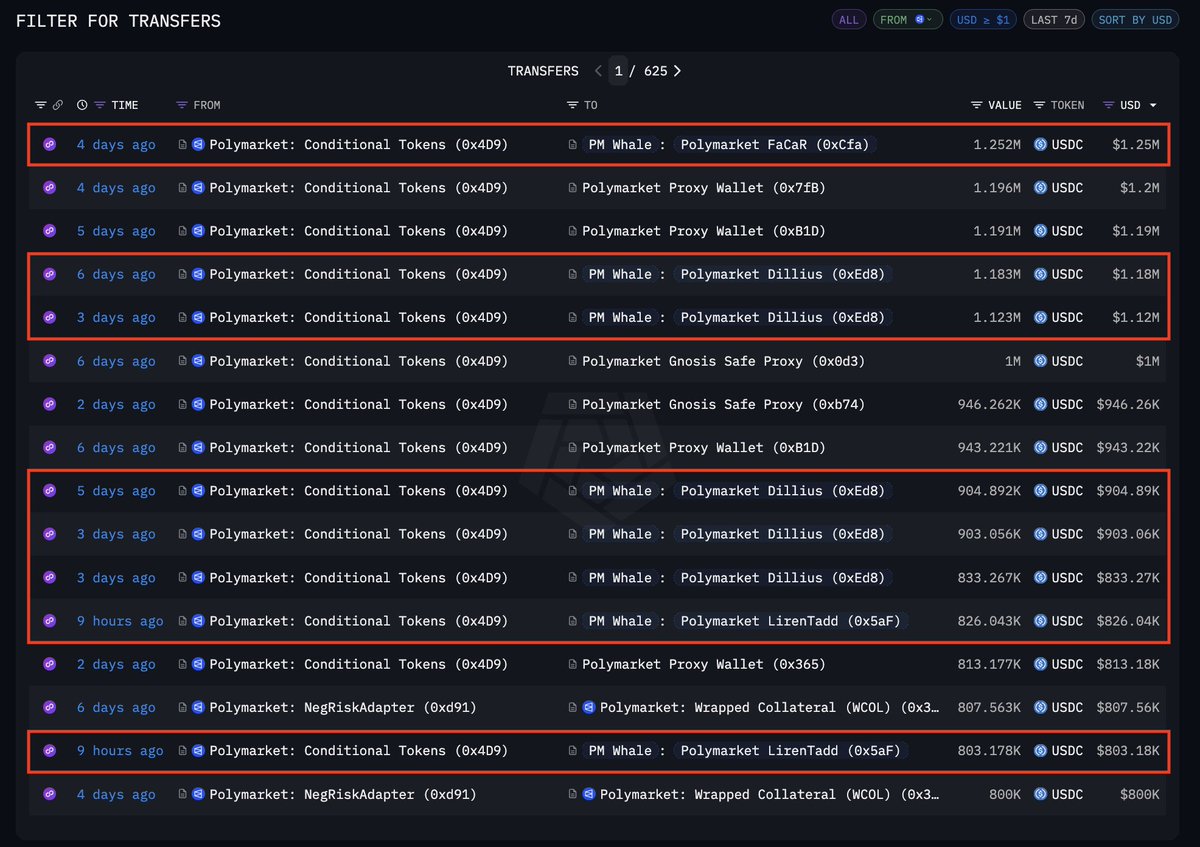 He uses at least 3 wallets - ‘FaCaR’, ‘lirenTadd’, and ‘Dillius’, all of whom frequently bet high 6-figures, and have occasionally bet millions of dollars on a single market.