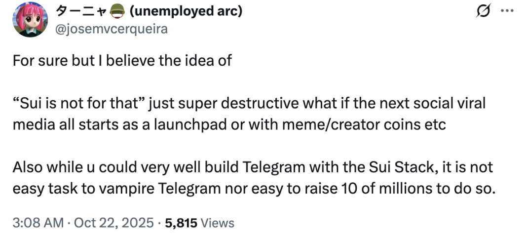In response, a member of the Move ecosystem Web3 solution provider IPX Labs, who is also a developer of the Sui ecosystem meme/launchpad project, with the X handle @josemvcerqueira, expressed agreement and subtly indicated that Sui also has similar issues to the Ethereum ecosystem, where projects are judged based on personal preferences.