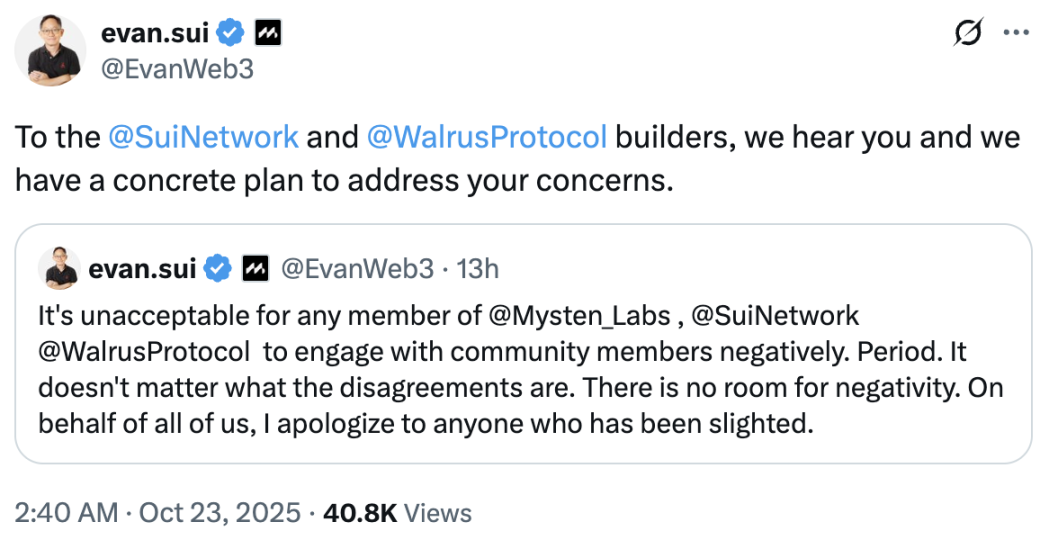 After realizing that team members had said some inappropriate things, Sui co-founder and CEO Evan Cheng stepped forward to apologize to all those who felt belittled and stated that regardless of the differences, negative communication between any members of Mysten Labs, Sui, and Walrus with the community is not allowed. Subsequently, Evan Cheng indicated that he would provide specific plans to address the issues for the builders of Sui and Walrus.