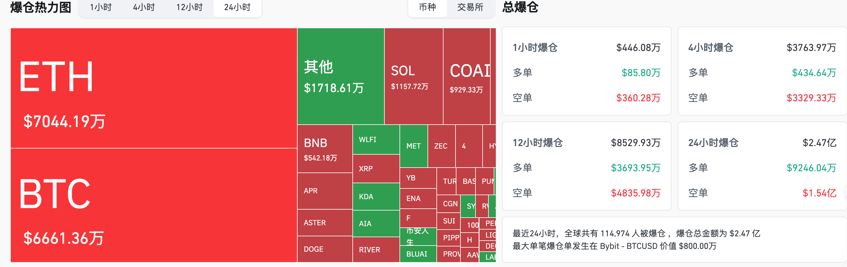 24-hour liquidation data: A total of 114,974 people were liquidated globally, with a total liquidation amount of $247 million, including $66.61 million in BTC, $70.44 million in ETH, and $5.42 million in BNB.